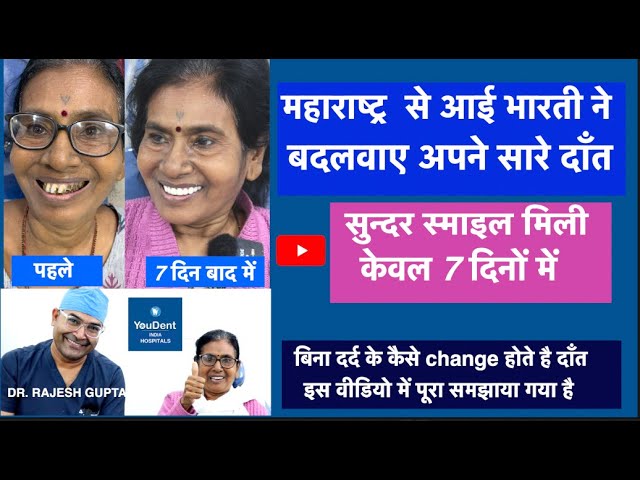 a patient named ms Bharti came from Maharastra .she was very depressed from her teeth she was not able to chew anything she came youdent hospital for ripoff her problem she was searching best implant surgeon in India best implant hospital in india .finaly he got dress of youdent jaipur .she find dr Rajesh gupta is a best dentist in india who is dealing successfully very difficult cases in dentistry |dr Rajesh gupta has done maximum cases of implants in india |and all patients are very happy who has got treatment under dr Rajesh gupta from youdent hospital jaipur .youdent hospital situated heart of the city i9n jaipur |she came and took full mouth dental implants |she is very happy after getting treatment from youdent .and she sad dr Rajesh gupta is a best dentist in jaipur and dr Rajesh gupta is a best dentist in india |youdent hai to smile hai